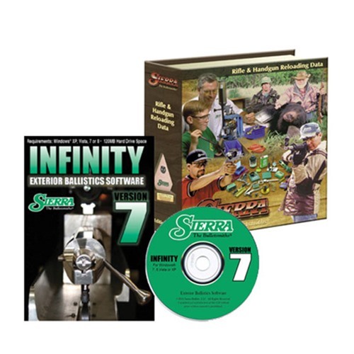 Sierra's INFINITY Exterior Ballistic Computer Software version 7 provides multiple trajectory charts and graphics, point blank range, calculate zero, uphill/downhill shooting, maximum range, minute of angle, profiled wind, improved atmospherics, revised print formats trajectory in mils and more. Easy to use Windows format makes INFINITY extremely user friendly. Bullet library includes all major bullet companies as well as ammunition companies and allows for addition of new and custom bullets. Renowned Sierra Ballistic Consultants Ted Almgren and Dr. Bill McDonald, who have written all Sierra Software since 1970, also wrote INFINITY 7. Both are retired Chief Scientists from a major aerospace company. This program is available in CD-Rom format only. Interface and program architecture design by Rodney Korn. Includes bothe the INFINITY Exterior Ballistic Version 7 Software, and the Sierra 5th Edition Reloading Manual hard copy.