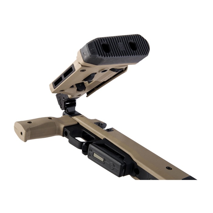 - Helt ambidextrous med utbytbar bolt-cutout platta och reversibel kindstöd.
