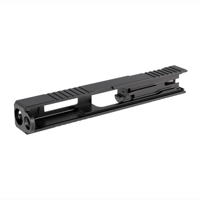 Our RMR Slide for Glock® 17 Gen4 pistols features distinctive, wraparound front cocking serrations that aid in manipulating the slide to check the chamber or clear a jam. Let's be honest: the serrations also look cool! These slides have a built-in mount for the popular Trijicon RMR red dot sight and certain Holosun sights (see list below), enabling shooters to get on-target faster and more easily than they can with standard pistol sights. All RMR Slides also have Glock® factory front and rear sight dovetails for backup iron sights. To get proper co-witnessing with the RMR, you will need to also install suppressor-height iron sights. You can get your RMR Slide for Glock® 17 Gen4 with a "window" cutout on top between the front serrations (so no wraparound serrations on this one) that enhances airflow to keep the barrel cooler - ideal for hard-working action competition pistols. Plus, if you have an upgraded barrel with a contrasting finish or a unique exterior pattern (fluting, spirals, "flames," etc.), the window helps your gun stand out from the sea of matte black on the firing line! Each RMR Slide for Glock® 17 Gen4 pistols starts life as a billet of 17-4 stainless steel that is machined to Glock® factory specifications inside, so it’ll fit factory frames and accept factory or aftermarket barrels and Gen4 internal parts. Each slide is heat-treated to Rockwell "C" 41-44 for enhanced surface hardness and excellent resistance to galling and wear. A tough, non-reflective, Black Nitride finish resists surface scuffs and scratches. Fits Gen4 Glock® 17 pistols & clones Machined from 17-4 stainless steel billet Tough Black Nitride finish Choose traditional Solid top or distinctive top Window cutout Pre-cut Trijicon RMR red dot sight mounting slot Also accepts Holosun HE508T, HS507C & HS407C red dots A Brownells RMR Slide is an excellent upgrade that takes a factory Glock® 17 Gen4 from good to GREAT. It can also serve as the perfect "top half" for a brand-new custom gun built on the popular Polymer80 80% frame. Brownells Gun Tech™ Note: Channel liner required for these slides. Channel liner is a press fit and requires a tool to install. We recommend #777-100-017. Includes patented optic cut technology pioneered by ZEV Technologies. Patent No. RE47335