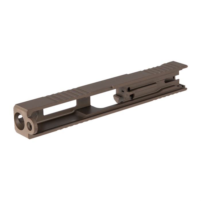 The limited production Brownells Brown RMR Slide for Glock® 19 Gen3 pistols features a pre-cut slot for easy, secure, low-profile mounting of a Trijicon RMR or Holosun red dot sight. Up front, there are distinctive, cocking serrations that aid in manipulating the slide to check the chamber or clear a jam. And we’ll admit it: the serrations just look cool, too. All RMR Slides also have standard Glock® factory front and rear sight dovetails for "iron" sights. To get proper co-witnessing with the RMR, you will need to also install suppressor-height iron sights. These limited production Brownells Brown slides for the Glock® 19 Gen3 come with a "window" cutout on top between the front serrations that enhances airflow to keep the barrel cooler - ideal for hard-working action competition pistols. Plus, if you have an upgraded barrel with a contrasting finish or a unique exterior pattern (fluting, spirals, "flames," etc.) the window lets you show it off a bit! A Brownells RMR Slide is the ideal upgrade for your factory Glock® 19 Gen3 OR the perfect "top half" for a brand-new custom gun built on a Polymer80 80% frame. Fits Gen3 Glock® 19 pistols & clones Built-in Trijicon RMR mounting slot Also accepts Holosun HE508T, HS507C & HS407C red dot sights Factory front/rear iron sight cuts, too Machined from corrosion-resistant 17-4 stainless steel billet Each RMR Slide for Glock® starts life as a billet of 17-4 stainless steel that is machined to Glock® factory specifications inside, so it’ll accept factory or aftermarket barrels and internal parts. Each slide is heat-treated to Rc 41-44 on the Rockwell C scale for added surface hardness and wear resistance. The Brownells Brown slide is a limited production and once they are gone, they’re gone. Brownells Gun Tech™ Note: Channel liner required for these slides. Channel liner is a press fit and requires a tool to install. We recommend #777-100-017. Includes patented optic cut technology pioneered by ZEV Technologies. Patent No. RE47335