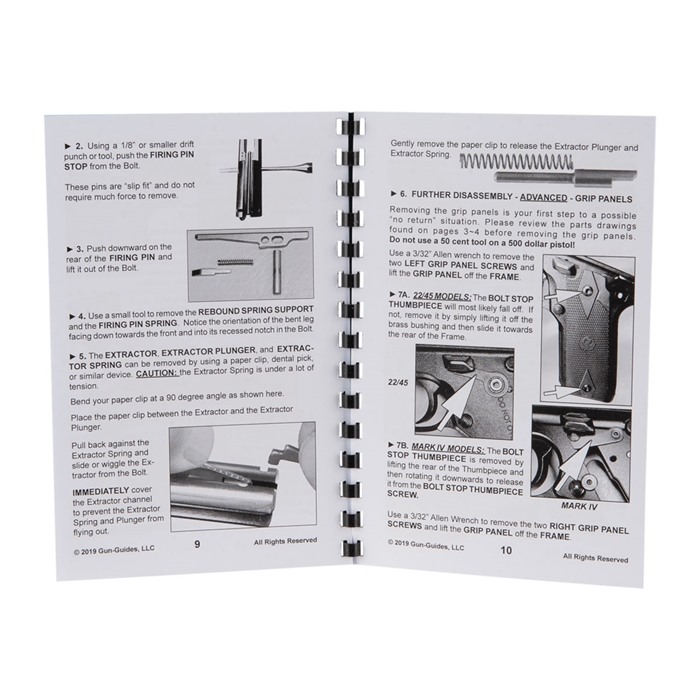 Ruger® Mark IV TM Standard, Target, Hunter, Competition, Tactical, and all 22/45 TM models. Disassembly, cleaning, lubrication, and reassembly for all models. FEATURES: The only current printed manual that includes information on ALL models. Easy to use -- Comb binding lies open and flat on your work surface. 26 pages & 69 high-resolution grayscale images. Exploded view and numbered list of all 74 parts for the RUGER®, Mark IVTM and 22/45TM models. 27 Must-have upgrades and accessories Cardstock cover. Bright white paper.