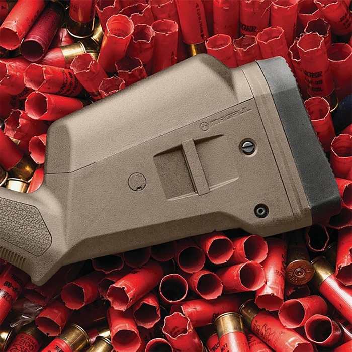 The SGA Stock is an ambidextrous, user-configurable buttstock designed to add much-needed adjustability to the tried-and-true Mossberg 500 / 590 / 590A1 12-gauge series of shotguns. Its features include a spacer system for length of pull adjustment, improved grip ergonomics, a recoil-reducing butt-pad, and optional cheek risers for use with optics/raised sights and other accessories. The Mossberg SGA brings Magpul design and engineering to another classic American firearm. Available in Black, Flat Dark Earth, Stealth Gray and Orange to adapt to the mission at hand. Made in the USA. FEATURES Spacer-adjustable lop in 1/2" increments from 12.5" to 14.5" Recoil-reducing butt-pad Integral right/left 1.25" sling loops SPECS Platform: Shotgun Compatibility: Mossberg® 500/590/590A1 12-gauge Butt-Pad Dimensions: 1.5 x 5.0 in. LOP Adjustment Range: ~12.3-14.3 in. Weight: 1.5 lbs. (with two Spacers installed) Width of Butt, max: 1.5 in.