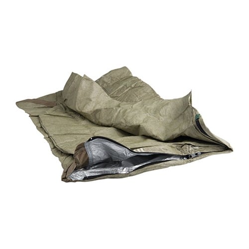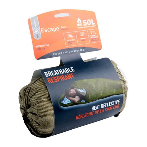 The SOL Escape™ Bivvy is nothing less than a revolution in backcountry shelters. The complaint with most ultra-light emergency shelters is the same: condensation builds up inside as you get warm, leaving your clothes soaking wet. With the Escape™ Bivvy, condensation is no longer an issue, and you never again have to choose between staying dry and staying warm. The proprietary fabric lets moisture escape at the same time that it keeps rain, snow, and wind on the outside – all while reflecting your body heat back to you. Waterproof seams plus a drawstring hood closure and side zip mean you can seal out the elements entirely or use the bivvy like a traditional sleeping bag. The low-visibility OD Green color with repeating black logos is ideal for those times when survival means you don’t want to be seen. Hard-wearing fabric resists punctures and tears through heavy use.