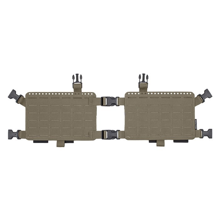 Panelens övre del är utrustad med integrerade ankare för att ge bäraren en säker lösning för intern magasinretention när den kombineras med vårt bungee retention kit, eller för att fästa säkra föremål som förvaras på chest rig-fickorna.