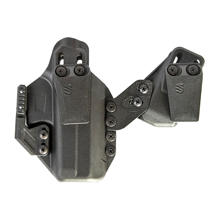 - Premiumkonfigurationen inkluderar justerbar dold bärklor för att minska tryck, justerbar inuti midjan magasinbärare med bältesklämma, och en tillbehörsmonteringsvinge för att förena holster och magasinbärare till en plattform.