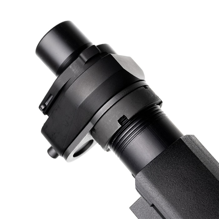 För att ta bort adaptern, tryck på knappen och vrid moturs 30 grader. Bakstocken separeras då från vapnet. För att återfästa, justera de två delarna, tryck in och vrid medurs 30 grader. Den stål-låsande mekanismen säkrar automatiskt adaptern. Med en konstruktion av 7075 aluminium och stålinteriörer är RAB-AD både robust och lätt.