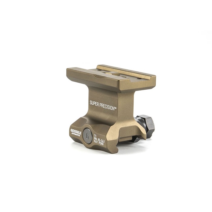 The Super Precision T1 Series was developed specifically to work with the Aimpoint T1 and similarly mounted red dot optics. These mounts are precision machined from a single piece of 7075-T6 high strength aluminum and are available in both co-witness and lower third co-witness options. They are also available in black type 3 hard coat anodize as well as Geisseles' proprietary DDC (Desert Dirt Color) type 3 hard coat anodize. Utilizing Geissele’s update of the classic nut and bolt method, this mount will attach your red dot to your weapon with 1,400 pounds of clamping force, and features 3 shear lugs for maximum rigidity and return to zero.