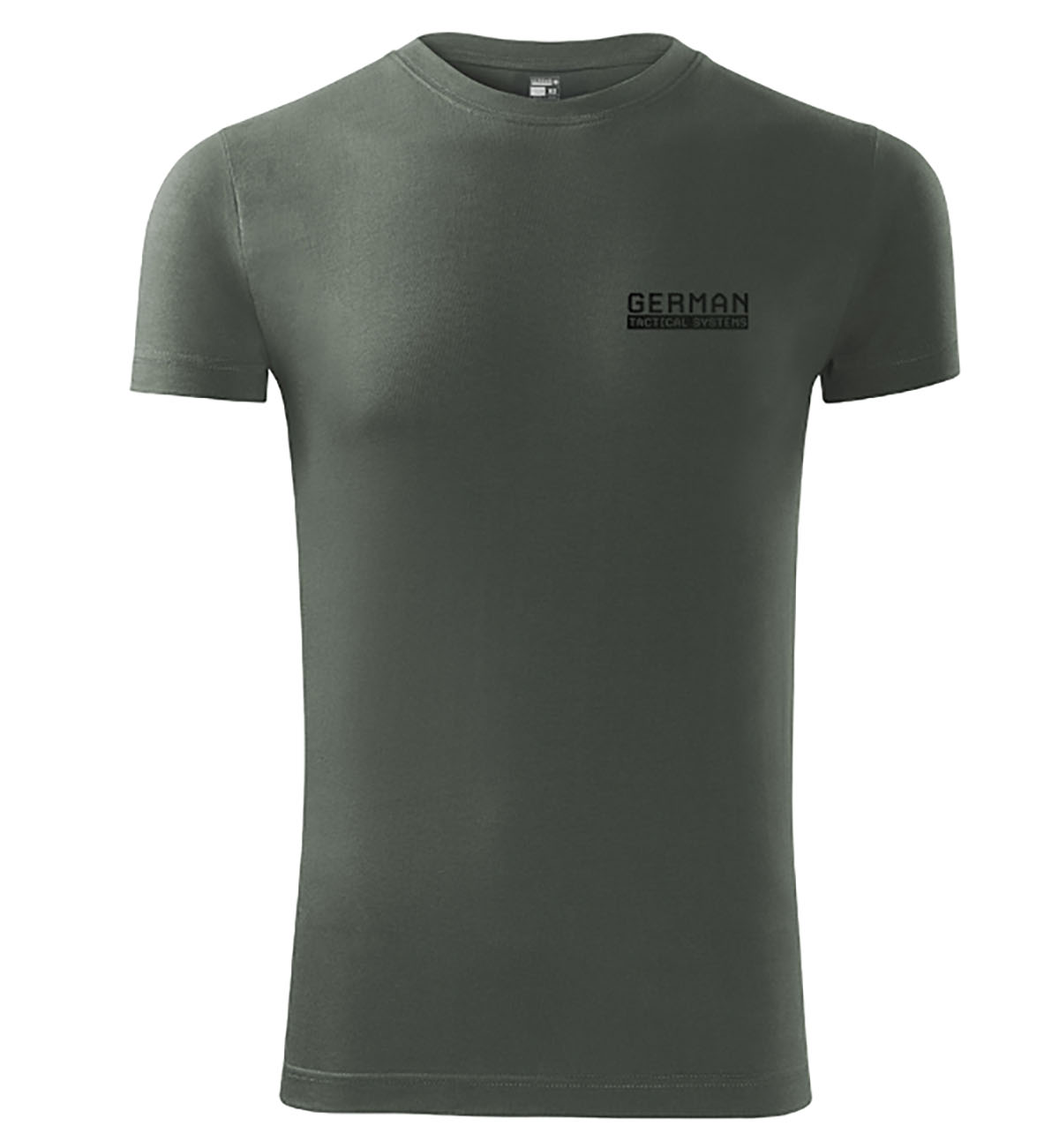 Detta är en mörk skifferfärgad t-shirt med German Tactical Systems logotyp på bröstet och GTS Evolution tryckt på ryggen.