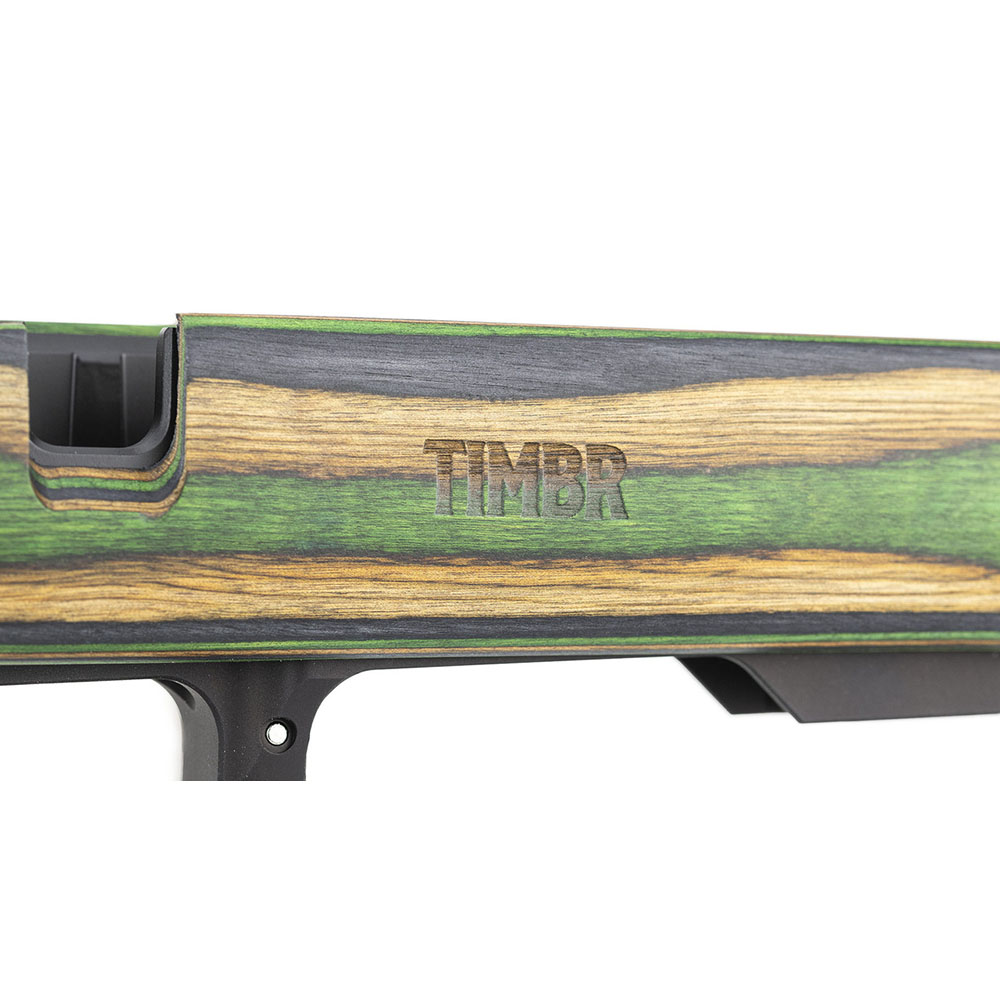 MDT Timbr Frontier har utvecklats för att ge utseendet och känslan av en traditionell stock, samtidigt som den inkorporerar precisionen och upprepbarheten från den moderna V-Block-bäddningen i en chassi. Buttstocken och föränden är tillverkade av björk hårdträlaminat, vilket ger varje stock ett unikt träådring och en varm känsla. De är sedan lackerade med en högkvalitativ klarlack och fästa vid den aluminium mikro chassit och bottenmetallen.