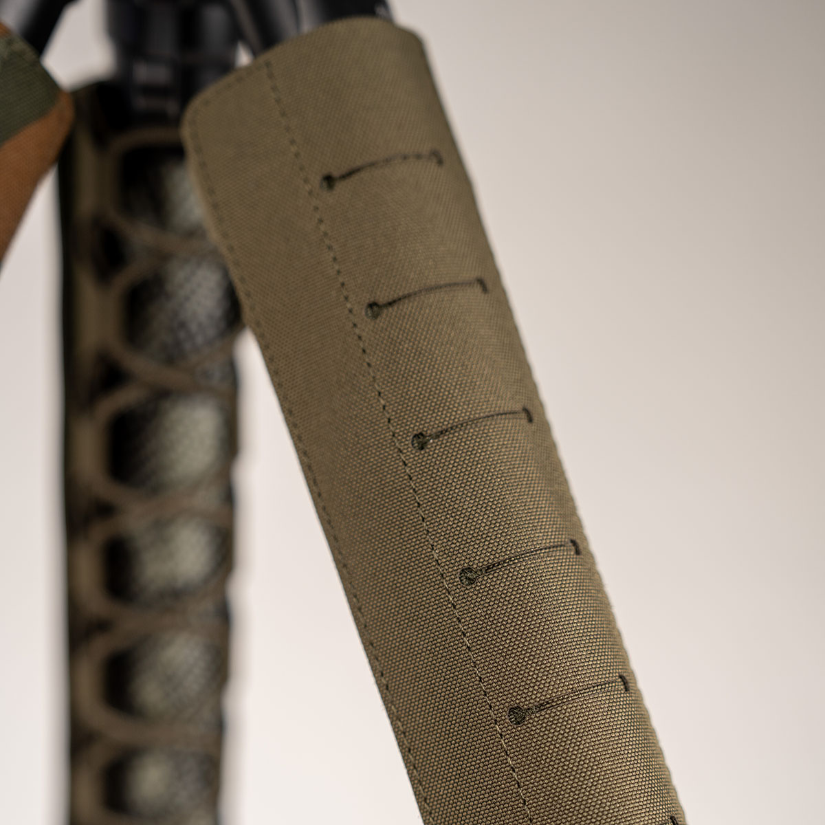 726529841909 The GTS Tripod Camo Leg Wraps are designed for shooters who want maximum concealment without limiting the functionality of their tripod. Unlike compact covers, these wraps are built as full-length camouflage nets that can cover the entire tripod leg - even when fully extended. Each wrap is made from lightweight, structured camouflage mesh that breaks up the straight lines and technical appearance of the tripod. This helps reduce visual signature in hunting and professional field environments, where hard edges and reflective surfaces can stand out against natural terrain. The wraps are secured in place using durable elastic cords, ensuring a tight and reliable fit along the full length of the leg. Once installed, they remain stable during movement and position changes without interfering with leg adjustment or overall tripod performance. In addition to camouflage, the netting also provides a light protective layer against scratches and minor abrasion, while maintaining minimal added weight. The breathable material prevents moisture buildup and dries quickly after exposure to rain or damp vegetation. The GTS Tripod Camo Leg Wraps are available in Flecktarn and Stone Grey Olive, allowing you to adapt your tripod to different environments and operational requirements. Full coverage. Reduced signature. No compromise on function.