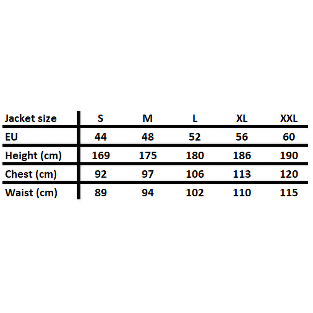 Jackan finns i fem olika storlekar: S, M, L, XL, XXL.