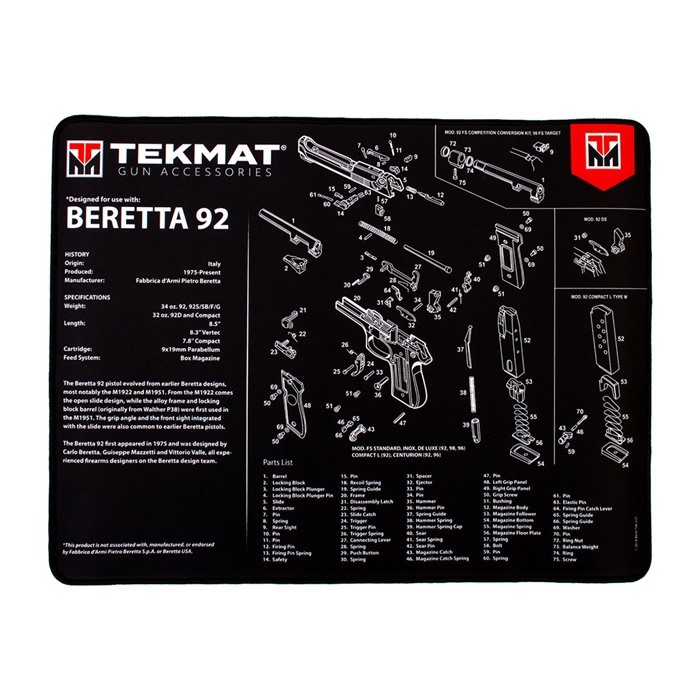 Den kompletta serien av TekMat Ultra 20 Pistol Cleaning Mats inkluderar en delarlista som matchar tillverkarens lista över delar, så det finns ingen risk för förvirring, och du kommer alltid att veta vilken del som går var och vilka delar du kan behöva beställa för att reparera eller komplettera ditt vapen.