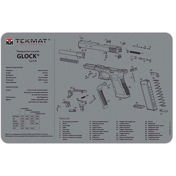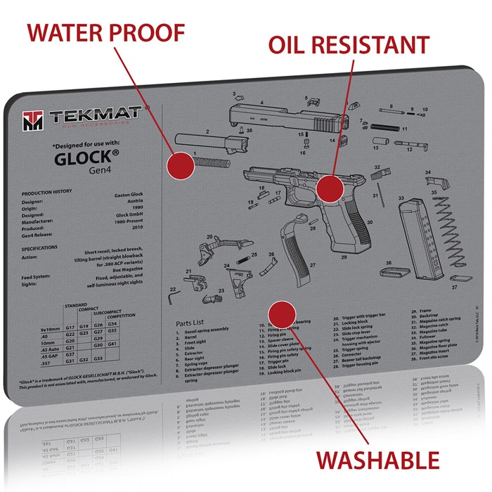 Företagets direktvulkaniseringsteknik fäster matts yta på en gummibakgrund, vilket ger vaddering och hållbarhet. Den kompletta serien av TekMat Ultra 20 Pistol Cleaning Mats inkluderar en del lista som matchar tillverkarens lista över delar, så det finns ingen risk för förvirring, och du kommer alltid att veta vilken del som går var och vilka delar du kan behöva beställa för att reparera eller komplettera ditt skjutvapen.