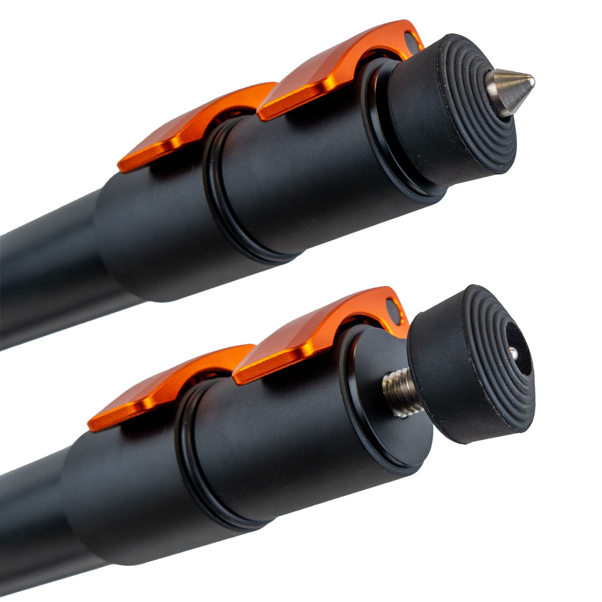 Med snabba cam-lås kan du justera benhöjden på några sekunder och lita på att de håller ordentligt för stabil skytte. Benen har också dubbelfunktionella fötter - vrid bara för att växla mellan gummipads för inomhus- eller hårda ytor och stålspikar för grepp på ojämnt terräng. Ingen anledning att byta delar; vrid bara benen för att aktivera spikarna.