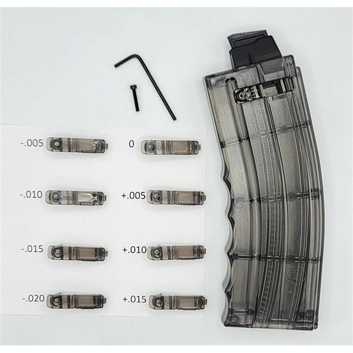 V208 AR-15 22 LONG RIFLE MAGAZINE With the ever-expanding gun market and the many rimfire platforms on the market with more being developed all the time, Black Dog Machine LLC is aware of the task to provide a magazine that covers nearly all of them. They have stepped up their game to develop a new more versatile magazine that has the ability to adjust to the minor production of differences in rimfire kits and dedicated platforms. They have achieved this by creating an adjustable lock up lug magazine they call the Version 208. V208 (208 is their Idaho area code) The new magazine has eight quick change inserts where the lock up lug is at. Using the provided 3/32 allen wrench, remove one screw to change inserts up or down in .005 increments to fine tune the desirable feed height for the individual kit or firearm. They have also added some new features like the front finger grooves. As a convenience, the adjustability is covered by their US patent as well as many of the new features. HOW IT WORKS: The factory lock in plate is “0”. If this lock up measurement doesn’t work for you, choose either + (Higher lock in) or – (Lower lock in) to customize the lock in setting to your rifle/pistol. INSERT SIZES: Standard- 0 Higher Lock up: +.005 +.010 +.015 Lower lock up: -.005 -.010 -.015 -.020 *** Thread screw and brass just enough for them to connect, does not need to be tight*** PN: V208-AR22MAG – (SMOKE OR NITRO GREEN COLOR) 25 ROUND MAGAZINE. INCLUDES: 1 EXTRA SCREW, 1 ALLEN WRENCH. Known-compatible conversion units, rifles & dedicated uppers Bear Creek Arsenal .22 LR Ciener/Atchisson Model 1 Sales Kriss 22LR Spikes Tactical Tactical Solutions Target Master SIG P522 SWAT Kel-Tec PLR22 Chiappa M4-22 Sig Sauer 522 WMD Guns LLC 22LR Rifle, MK4 Banshee .22LR NFA Bushmaster combo kit Nordic Components MANY OTHER .22 ATCHISSON/CIENER STYLE CONVERSION UNITS, UPPERS & RIFLES THAT MIGHT NOT BE LISTED Will Not work with: Tippman Arms M4 .22 Magnum .22 S&W M&P 15 .22 H&K 416.22/Umarex HK-416D Pistol Colt/Umarex M-4 Carbine M-4 OPS, M-16 Rifle Beretta ARX160 .22LR M-16 SPR, Rock River Kriss and other models that may not be listed.