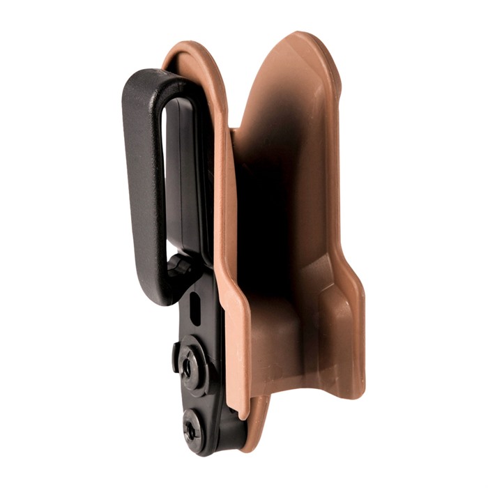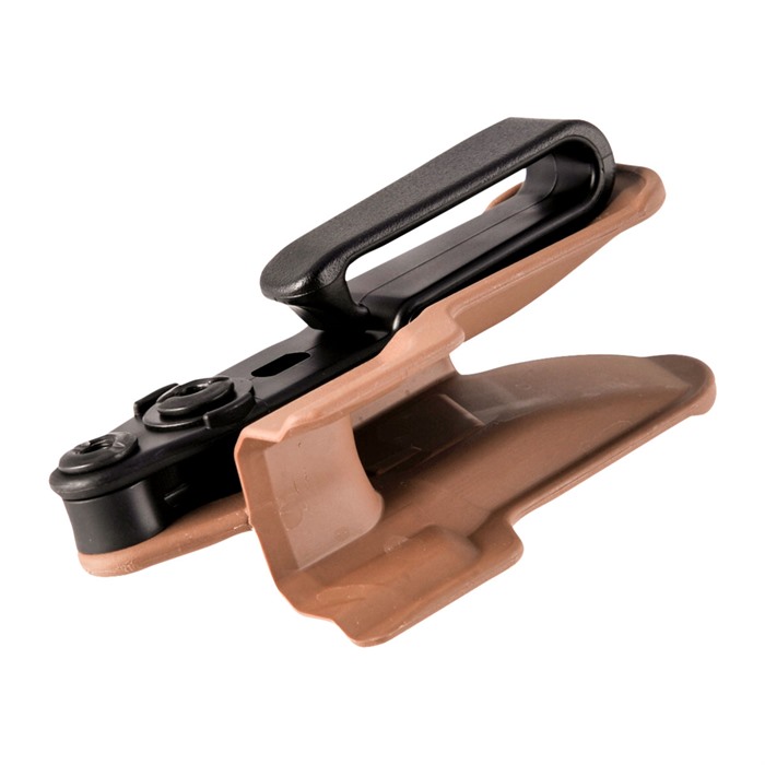 - Enhandsgrepp: Holstret kan också tas bort genom att fånga nosen på holstret och vrida av det, vilket möjliggör enhandsgrepp av vapnet även om tethers eller fästpunkten misslyckas.