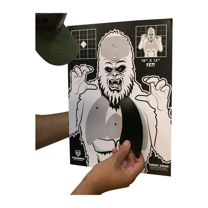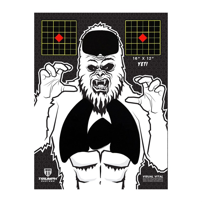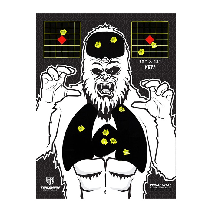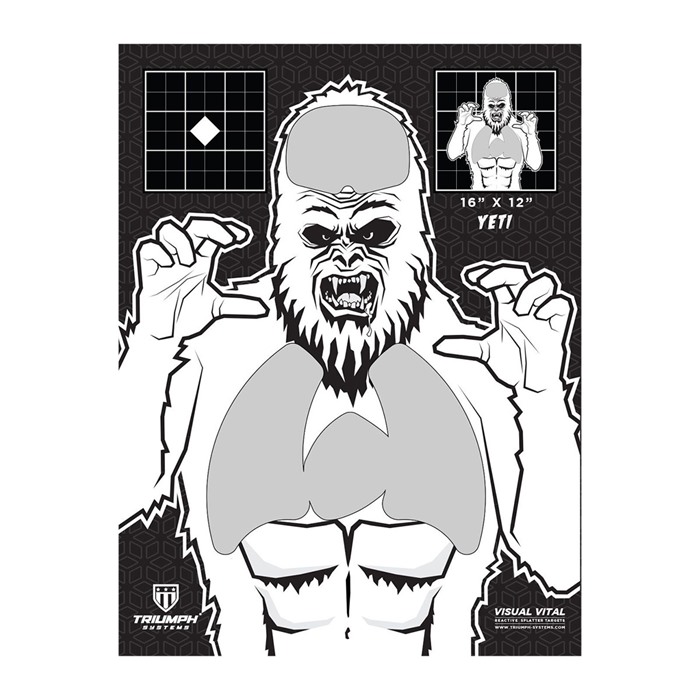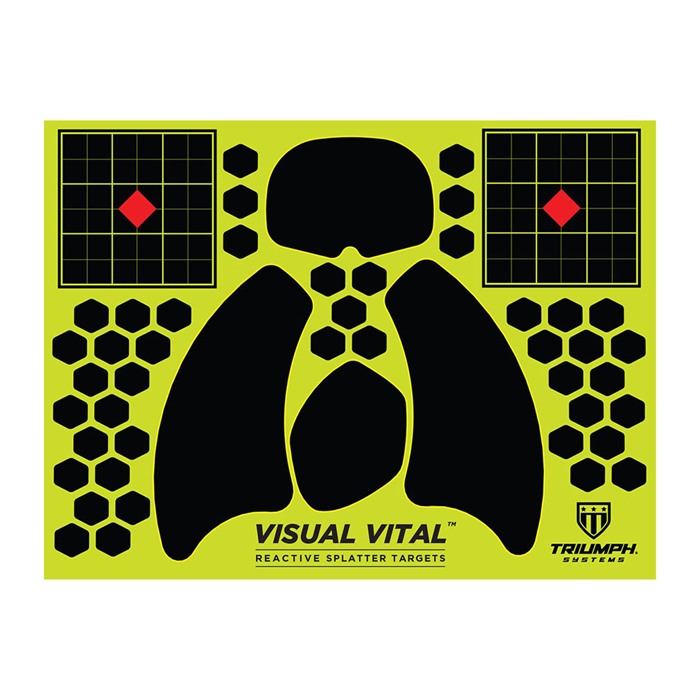 Triumph Systems Visual Vital splatter target är inte bara ett vanligt splattermål, det är tre mål i ett! Du får ett papirmål, självhäftande splatterklistermärken att placera över de roliga skyttezonerna och splattermålspastor att fästa över hålen du just skjutit.