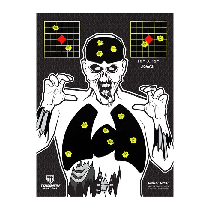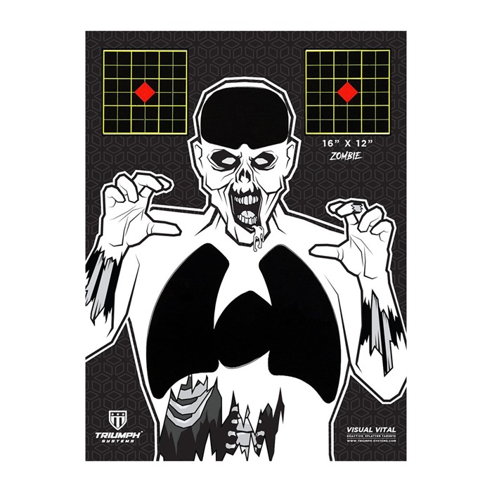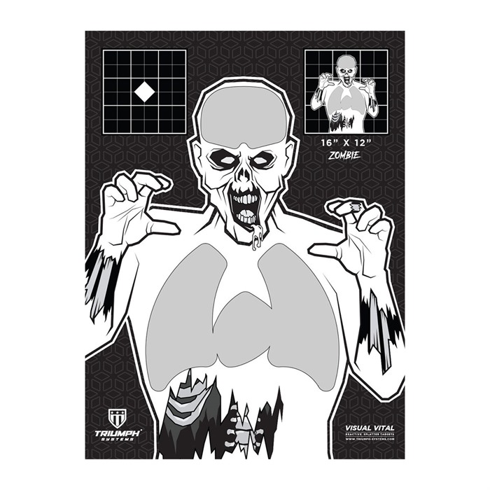 816247027102 Triumph Systems Visual Vital splattermål är inte bara ett vanligt splattermål, det är 3 mål i 1! Du får ett papirmål, klibbiga splatterklistermärken att sätta över de roliga skjutzonerna och splattermålspastiller att fästa över hålen du just sköt. Denna serie av reaktiva mål är utmärkta för både inomhus- och utomhusskytte. Se var du träffar målen på avstånd med lätthet, eftersom vårt reaktiva splatter är mycket synligt och perfekt för dem som vill ha mer för sina pengar. Ett 5-Pack innehåller tio 16"x 12" papirmål och 5 klistermärkesmål.Utgått från Brownells