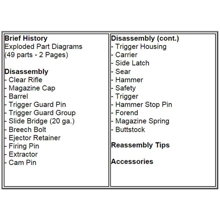 Denna guide är komplett med detaljerade, del-för-del scheman och omfattande, lättförståeliga monteringsanvisningar. Winchester 1300 & 1200 Shotguns Assembly and Disassembly Guide täcker alla aspekter när det kommer till att få en arbetskunskap om dessa vapen.