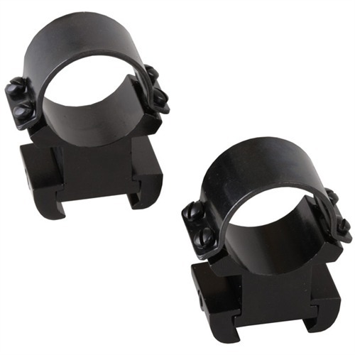 SPECS: Aluminum lower; steel cap, 4 screws, windage adjustment clamps. Allen wrench included. Black, gloss or matte finish. 1" (2.5cm) diameter. Heights measured from top of base to bottom of ring. Med., .180" (.5cm); High, .350" (.8cm); X-High, .575" (1.5cm).