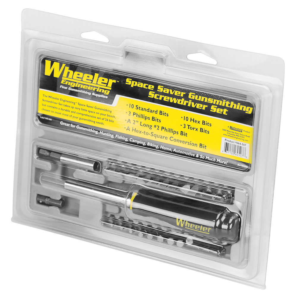 Wheeler® Space Saver Gunsmithing Screwdriver Set är mindre än hälften så stor som jämförbara skruvmejselsatser för vapensmeder. Den tar upp mycket lite plats på din arbetsbänk, men innehåller en hållbar och omfattande uppsättning av 26 bitar som valts för att möta de flesta av dina vapensmedsbehov.